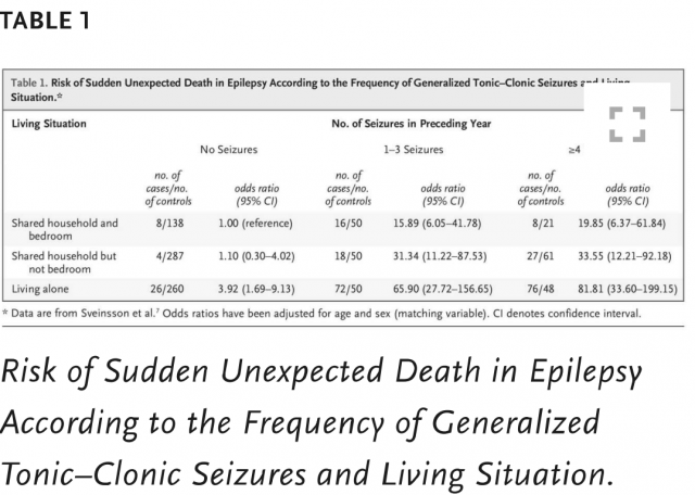 Le risque de décès augmente avec la fréquence des crises tonico-cloniques généralisées, mais est influencé par les conditions de vie. Vivre seul ou partager un logement sans partager une chambre est associé à un risque accru de mort subite ; une personne dormant seule et présentant des crises tonico-cloniques fréquentes court le risque le plus élevé (7) (tableau I).